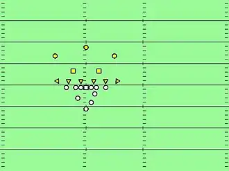 There are no rules regarding the formation of defensive players or their movement before the opportunity to take a set position. Therefore, the deployment and tactics of defensive players are bound only by the imagination of the play designer and the line of scrimmage. Below are some of the most popular defensive formations through the history of football.
