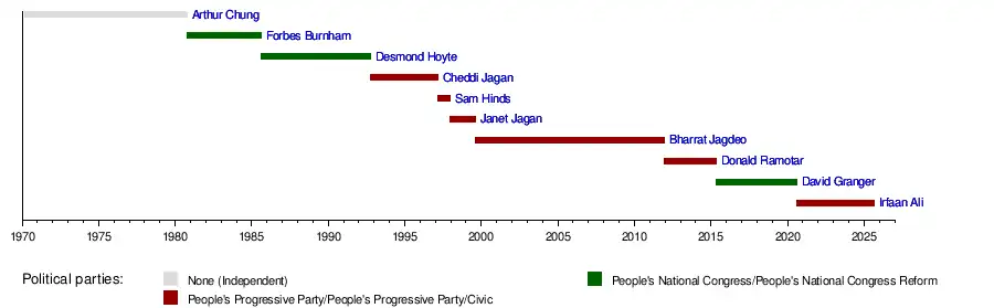 1. ^ Lost confidence vote on 21 December 2018; see 2020 Guyanese general election