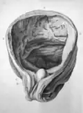 During Beethoven's autopsy, pathologist Johann Wagner[12] sawed Beethoven's skull open and cut out his temporal bones. When his body was exhumed in 1863, the temporal bones and six of his teeth were missing. His skull was in nine pieces. Some fragments were taken before the body was reinterred. They were later found to be held by Franz Romeo Seligmann.[13][14] |