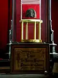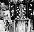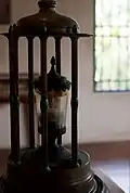 The remains of Bessette lie in Saint Joseph's Oratory, the church he helped build. His body lies in a tomb built below the Oratory's Main Chapel, except for his heart, which is preserved in a reliquary in the same Oratory. The heart was stolen in March 1973, but was recovered in December 1974 with the help of criminal lawyer Frank Shoofey.[21] | ||