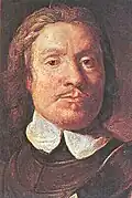 Oliver Cromwell died in 1658. Charles II had Cromwell's body disinterred, hung and decapitated in 1661. The head was impaled on a pole at Westminster Hall until 1684. It was lost for years before being sold to Claudius Du Puy, who had a "museum of freaks and curiosities".[41] The head passed to various private collectors and museums until 1960, when it was buried at Sidney Sussex College in Cambridge.[42] | ||