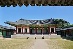 The main building of the p'yŏnjŏn.[77] It was completed in 1395.[78][5] After being destroyed in 1592, it was rebuilt in 1867.[31][79][5] The building's exterior has since survived until the present.[5] The building is on top of a three-tiered stone platform. The interior is a single, large, elaborately painted room with a throne.[80] |