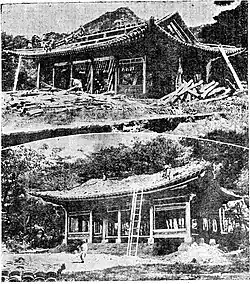 The palace was greatly expanded upon during the reign of Sejong the Great (r. 1418–1450).[2] Afterwards, it remained in a roughly stable state for around 100 years,[3] with the exception of a major fire it experienced in 1553.[4] The palace was completely destroyed in the 4th month of 1592, during the 1592–1598 Imjin War.[5] The site remained abandoned until it was rebuilt from 1865 to 1873.[6] The palace experienced two major fires in 1873[7] and 1876.[8] Reconstruction after the fires concluded in 1888.[9] At that point, the palace had around 500 buildings.[10]