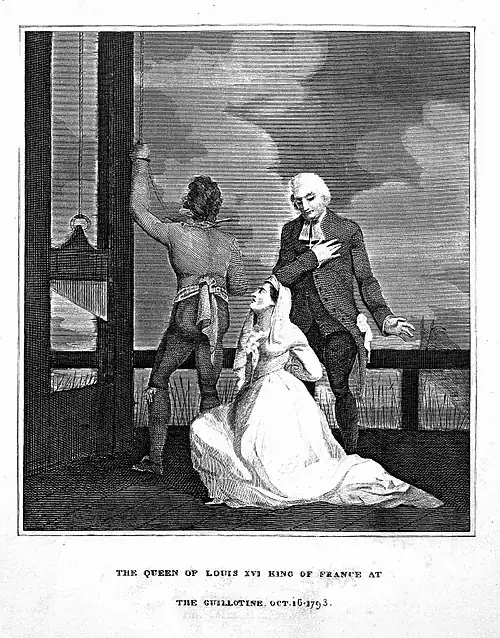 - ^ Also reported as, "Gentlemen, I am innocent of everything of which I am accused. I hope that my blood may cement the good fortune of the French."[2] and as "Je meurs innocent de tous les crimes qu'on m'impute. Je pardonne aux auteurs de ma mort, et je prie Dieu que le sang que vous allez répandre ne retombe jamais su la France... Puisse mon sang cimenter votre bonheur!" ("I die innocent of all the crimes laid to my charge. I forgive the authors of my death, and I pray God that the blood which you are about to shed may never fall on France.... May my blood cement your happiness!"[61]
