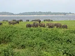 National parks are a class of protected areas in Sri Lanka and are administered by the Department of Wildlife Conservation. National parks are governed by the Fauna and Flora Protection Ordinance (No. 2) of 1937 and may be created, amended or abolished by ministerial order.[1] All of the land in national parks are state-owned and the entire habitat is protected.[1] Activities prohibited in national parks include hunting, killing or removing any wild animal; destroying eggs/nests of birds and reptiles; disturbing of wild animals; interfering in the breeding of any animal; felling/damaging of any plant; breaking up land for cultivation/mining/other purpose; kindling/carrying of fire; and possessing/using any trap/explosive/poison to damage animal or plant life.[1] Visitors are allowed to enter national parks but only for the purpose of observing flora and fauna and with a permit.[2] There are currently 26 national parks which together cover an area of 5,734 km2 (2,214 sq mi).[2]