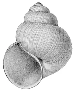 drawing of apertural view of the shell of Lanistes ovum, a freshwater snail which is native to Mozambique