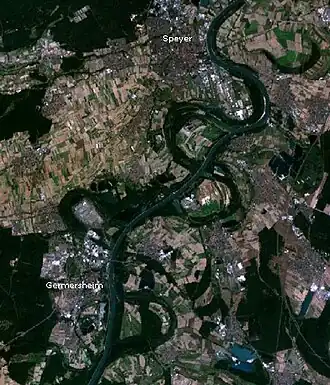 near Otterstadt, Rhein-Pfalz-Kreis, Rhineland-Palatinate (looking down the Rhine):- Angelhofer Altrhein (49°21′33″N 8°28′13″E / 49.35917°N 8.47028°E; l), near Otterstadt and in the Gebiet the kreisfreien Stadt Speyer;