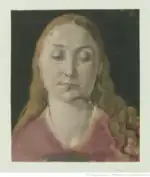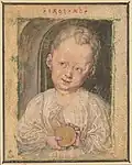 - ^ The copy at the Museum der bildenden Künste, Leipzig, shows a monogram in the open book of the statuette on the reveal; also missing in the supposedly original in Berlin the inscription on the sheet of paper on the wall at the top right reads: "Also pin ich gestalt / Jn achcehe Jor altt / .1.4.9.7." (I am 18 years old). The Fürleger insignia below is a later addition, also in the Portrait of a Young Woman with Her Hair Down.