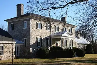 Plantations that operated within the present-day boundaries of West Virginia were located in the counties of the Ridge-and-Valley Appalachians and in the Kanawha and Ohio River valley regions. Beginning in the mid-to-late 18th century, members of the Washington family and other prominent Virginia families began to build elegant Georgian mansions on their plantations in the Ridge-and-Valley Appalachians region of present-day West Virginia.[1] Plantations initially developed in the counties lying within the Northern Neck Proprietary of Thomas Fairfax, 6th Lord Fairfax of Cameron within the Shenandoah Valley and South Branch Potomac River valleys.[2] Slavery as practiced through plantations in the American South was carried over from the plantations of the Piedmont and Tidewater regions of Virginia, where plantations had become the foundation of society and industry.[2] Following the French and Indian War, settlement and agricultural development continued unabated in the Shenandoah and South Branch Potomac valleys.[3] Early instances of western Virginia plantations with grand homes include the John Ariss-designed Harewood (1774) for George Washington's brother Samuel Washington and Happy Retreat (1780) built by Washington's younger brother Charles Washington, both of which are located near Charles Town in present-day Jefferson County.[4][5][6] In Hampshire County, Nicholas Casey constructed a Georgian mansion (1774) at his Wappocomo plantation, one of the first plantation houses of its kind in the South Branch Potomac River valley.[7]