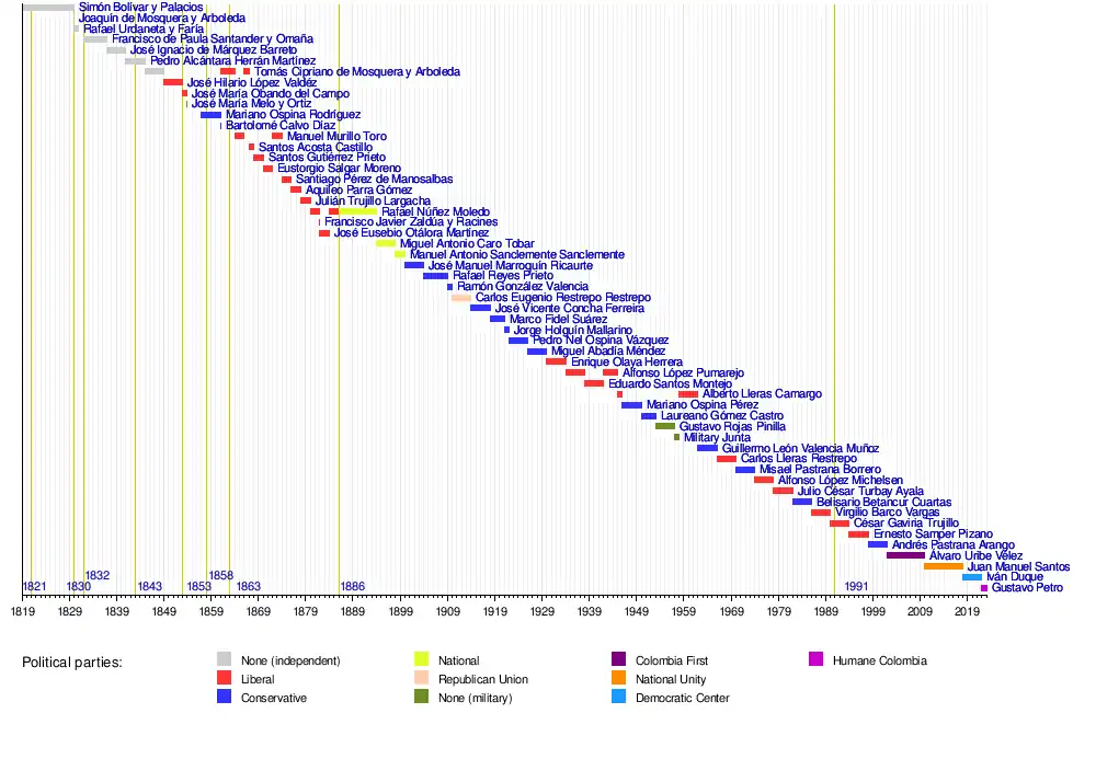 - ^ a b c d Between 1958 and 1974 the presidency, under the National Front alternation plan, was held in an alternating manner by members of the two traditional parties: Liberals and Conservatives.