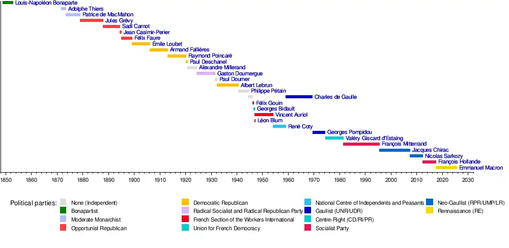 Emmanuel MacronFrançois HollandeNicolas SarkozyJacques ChiracFrançois MitterrandValéry Giscard d'EstaingGeorges PompidouRené CotyLéon BlumVincent AuriolGeorges BidaultFélix GouinCharles de GaullePhilippe PétainAlbert LebrunPaul DoumerGaston DoumergueAlexandre MillerandPaul DeschanelRaymond PoincaréArmand FallièresÉmile LoubetFélix FaureJean Casimir-PerierSadi Carnot (statesman)Jules GrévyPatrice de MacMahonAdolphe ThiersNapoleon III