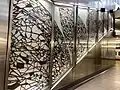 Spectre | Farringdon station | 2018 | Simon Periton | Glazing motif | — | Based on a drawing by Christopher Dresser titled Force and Energy (c. 1867–1873), contemporary with Smithfield Market which is adjacent to the station. Periton's design also references the etched glass found in Victorian pubs.[9]