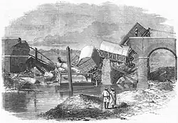Crash scene after the Staplehurst accident 9 June – United Kingdom – Staplehurst rail crash – A South Eastern Railway boat train is derailed on a bridge over the River Beult at Staplehurst, Kent after track workers misread a timetable and remove a rail. Ten people are killed, and 49 are injured. Author Charles Dickens is amongst the survivors.