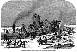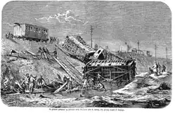 Scene of the Railroad Disaster at Meadow Brook, Rhode Island, a wood engraving from a sketch by Theodore R. Davis, published in Harper's Weekly, 10 May 1873. The accident occurred on 19 April 1873, at Wood River Junction. 19 April – United States – A passenger train is derailed at Meadow Brook, Rhode Island, near Wood River Junction, due to a bridge being washed away in a dam collapse.[138][139] Nine passengers are killed.[140]