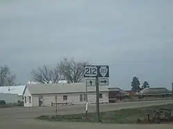 The intersection of S-323 and U.S. Route 212 in Alzada, April 2016.