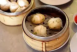 China | A dumpling served in dim sum,[14] sometimes called a "shrimp bonnet" for its pleated shape. Traditionally, should have at least seven and preferably ten or more pleats imprinted on its wrapper. The wrappers are made with boiling water, to which wheat starch, tapioca starch, oil and a small amount of salt are added.[14] The filling contains shrimp, cooked pork fat, bamboo shoots, scallions, cornstarch, sesame oil, soy sauce, sugar, and other seasonings.[14] The pouch-shaped dumpling is then steamed in a bamboo basket until translucent. Listed at number 34 on World's 50 most delicious foods readers' poll compiled by CNN Go in 2011.[15] | ||||