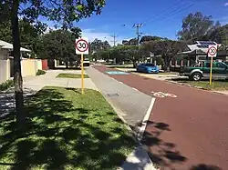 Leake Street was converted to a "bike boulevard" in 2017, with a speed limit of 30 kilometres per hour (19 mph).[12]