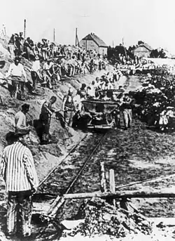 The following is a list of subcamps of the Sachsenhausen concentration camp established by Nazi Germany. The main camp, with around 50 barracks for slave-labour prisoners, was located 35 kilometres (22 mi) from Berlin, and operated between 1938 and April 22, 1945. During World War II the prisoners included Germans, Poles, Soviet POWs, Roma, and later Jews. It is estimated that the number of victims of Sachsenhausen was 30,000–35,000.[1] Dozens of subcamps of Sachsenhausen existed directly in the capital city, serving individual business operators and factories.[2]