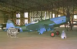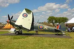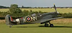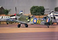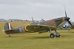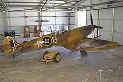 • Spitfire Tr.9 MJ772 (PH-KDH). Served with 341 Squadron, Royal Air Force as NL-W then with 340 Squadron as GW-A. Sold to Vickers-Armstrongs in 1950, converted to two-seat trainer. Carried Class B markings G-15-172. To Irish Air Corps in May 1951 as IAC 159. Withdrawn from flying in 1960. Sold to Film Aviation Services in November 1963 and stored at Biggin Hill. Sold to COGEA, Belgium in May 1964 and stored at Ostend Airport. Sold to Tony Samuelson in 1965 and registered G-AVAV in November 1966. Restored to airworthyness in July 1967. Leased to Spitfire Productions Ltd for use in the film Battle of Britain. A forced landing was made at Little Staughton on 9 July 1968 due to engine failure, and subsequently returned to flying condition. Later sold to Sir William Roberts and displayed as part of the Strathallan Collection, coded NL-R. Sold to Doug Champlin of Enid, Arizona, registered N8R. Later registered in Germany as D-FMKN.[85] Suffered off-airport landing in field, near Woodchurch, Kent, United Kingdom, on 7 September 2015. Pilot uninjured.[86][87] As of March 2019, airworthy owned by Warbird Experiences Ltd, based at Biggin Hill airfield.[88] In August 2021, MJ772 was flown to its new home in The Netherlands.[89]