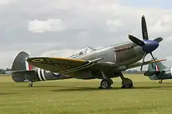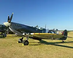 • Spitfire FR Mk.XIVe TZ138 (C-GSPT). Was built in early 1945 and served in the RAF before joining the Royal Canadian Air Force later that year for cold weather tests, even at one point fitted with skis that came off a Tiger Moth.[34] After military retirement, it was exported and registered in the United States with various registrations and participated in many air races. By the 1970s it became a restoration project and was rebuilt to airworthy condition in the US in 1999 before being exported to Canada with the registration C-GSPT.[35]