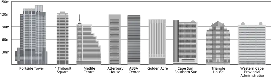 The Mutual Building was the tallest building in Cape Town for 23 years, before it was overtaken by the Sanlam Centre (Naspers Centre) in 1962.[2] After it was completed in 1972 and overtook the Trust Bank Centre (ABSA Centre) which is now called (The Foreshore Place) after being turned into a residential building, 1 Thibault Square (BP Centre) was the tallest building in the city for the next 42 years before Portside Tower was opened.[3]