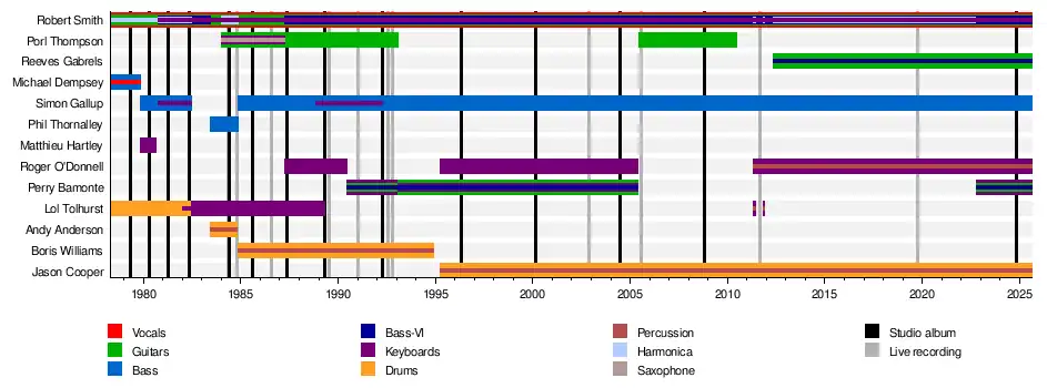 The Cure are an English alternative rock band from Crawley. Formed in May 1978,[1][2][3] the group originally consisted of vocalist, guitarist and keyboardist Robert Smith (the only constant member), bassist Michael Dempsey and drummer Lol Tolhurst. The current lineup includes Smith, bassist Simon Gallup (from 1979 to 1982, and since 1984), keyboardist Roger O'Donnell (from 1987 to 1990, 1995 to 2005, and since 2011), guitarist and keyboardist Perry Bamonte (from 1990 to 2005, and since 2022), drummer Jason Cooper (since 1995) and guitarist Reeves Gabrels (since 2012).