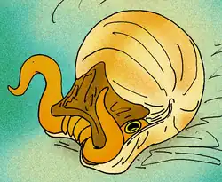Life restoration of two species of the Late Triassic ammonoid cephalopod Arcestes - †Arcestes gigantogaleatus – or unidentified comparable form
