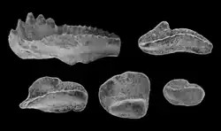 Illustration of a fossilized shell in multiple views of the Silurian monoplacophoran mollusc Tryblidium reticulatum. Head region is to the left. - †Tryblidium rugosum – type locality for species