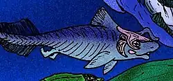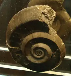 Restoration of the Late Ordovician nautiloid cephalopod Aphetoceras being preyed upon by a Cameroceras - †Aphetoceras subcostulatum