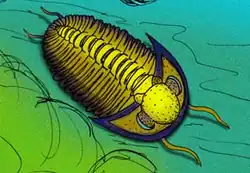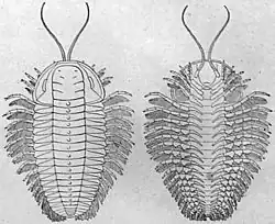 Restoration showing the top (left) and underside of the Late Ordovician trilobite Triarthrus - †Triarthrus becki