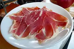 Jamón Serrano is a dry-cured ham, which is salted and then left to stand for at least 40 days. The process is concluded with a drying/ageing process of at least 110 days. Hams must have a weight of at least 9.2 kg.[56]