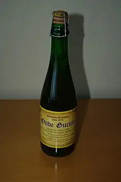 Gueuze (Dutch geuze, pronounced [ˈɣøzə];[79][80] French gueuze, [ɡøz][81]) is a type of lambic, a Belgian beer. It is made by blending young (1-year-old) and old (2- to 3-year-old) lambics, which is bottled for a second fermentation. Because the young lambics are not fully fermented, the blended beer contains fermentable sugars, which allow a second fermentation to occur.