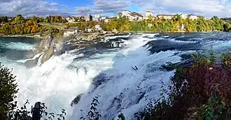 Largest waterfall in Europe, 150 m (490 ft) wide, 23 m (75 ft) high, located on the High Rhine near the town of Schaffhausen