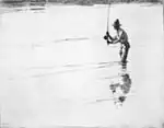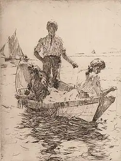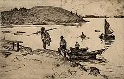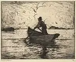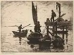 Salem Harbor was Benson's first etching, made while he was at the School of the Museum of Fine Arts, Boston[1] and published in the school's magazine Students in the School of Drawing. Benson was one of the editors of the magazine. Thirty years later, in 1912, Benson began etching again, a practice that thereafter became a major body of his work.[2] Two plates were made of The Anchorage that depicted a fisherman bringing a dory to shore. The first resulted in 48 proofs on shogun paper, 43 of which were signed. The second plate was more spacious than the first and resulted in 25 signed proofs printed on shogun paper. The work was exhibited in 1915 and 1916 four times.[3] Casting for Salmon is one of Benson's 359 etchings, most of which were made of waterfowl. In the simple composition of a fisherman reflected influence by Japanese artists and demonstrated his skill as an etcher.[1]