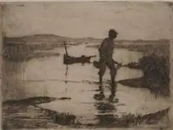 etching/print | 1914 | 9.8 in x 10.9 in (24.9 cm x 27.7 cm) | Scene: waterfowl hunter wading through marsh. | |
