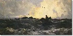Scene: male figure sits in rowboat on rough water as waterfowl fly overhead. SIRIS Collection Number 20492454[7] |