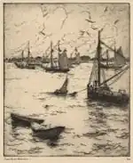 | Bound Home | Online image[13] | etching/print | 1918 | 9 in x 10.9 in (22.9 cm x 27.7 cm) or 6 in x 8 in (15.2 cm x 20.3 cm) |