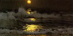 oil on canvas | 1891 | 15 in x 30 in (38.1 cm x 76.2 cm) | Art Institute of Chicago | Scene: nighttime waterscape with full moon reflecting off crashing white waves. SIRIS Collection Number 89170035[7] |