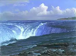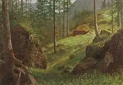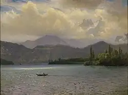 Bierstadt became part of the second generation of the Hudson River School in New York, an informal group of like-minded painters who started painting along the Hudson River.[1] Their style was based on carefully detailed paintings with romantic, almost glowing lighting, sometimes called luminism. Bierstadt was an important interpreter of the western landscape, and he is also grouped with the Rocky Mountain School.