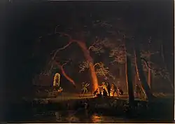 Campfire | 1863 | Oil on canvas | 43.2 cm × 62.2 cm (17.0 in × 24.5 in) | Mead Art Museum, Amherst College, Amherst, MA[2]: 332 42°22′15″N 72°30′56″W / 42.3709°N 72.5155°W IAP 20090516 |