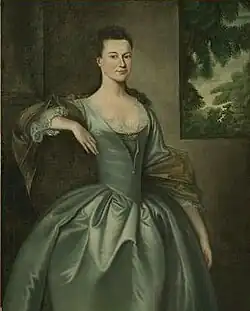 1755 Portrait of Mrs. George Bethune, oil on cavas 50 × 40 14 in. (127.0 × 102.2 cm.) Museum of Fine Arts, Springfield Subject: Mary Faneuil (1734–1797); daughter of Benjamin Faneuil (one of first paper manufacturers in Massachusetts); niece of Peter Faneuil (provided funds for Boston's public market and meeting house); wife of George Bethune (m. 1754, Boston); mother of George, Susan (Mrs. Edmond Dunkin), Penelope (Mrs. English), Jane (Mrs. William Hunt), and Ann (Mrs. Lovell).[6] IAP 22930027