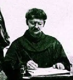 This means that he was Bosnian Franciscan who wrote in narodni jezik (transl. Peoples Language), which, beside Bosnian, was a common name for the South Slavic language, Štokavian dialect, among Bosnians at the time.[77][78] Divković was not always an original writer, but a translator and compiler. As a translator, he was not meticulous about being faithful to his sources, which means that he modified them to bring them closer to the folk mixed idiom of the Eastern-Bosnian Štokavian dialect and Ikavian–Ijekavian accent, spoken between Sarajevo, Olovo and Kreševo in Bosnia. His works and his style have been widely and continually researched as part of the Bosnian and Herzegovinian, Croatian, Montenegrin and Serbian written heritage, as the Shtokavian-Iekavian dialect of his native language eventually became the basis of the literary languages developed in all these countries in the 19th century.[79] In his homeland Bosnia and Herzegovina, Divković's legacy and importance, beside the religious doctrine and church teachings that he spread, is signified by his reputation as the first Bosnian typographer who printed the first Bosnian book, written in Bosnian using Bosančica, the language and the alphabet people in Bosnia spoke and could read.[79][77] Divković wrote his books to meet the needs of the Catholic folk.[80] His Veliki nauk (transl. Greater Doctrine – transl. Greater Christian Doctrine) from 1611 was intended for clerics, while Mali nauk (transl. Lesser Doctrine – transl. Lesser Christian Doctrine) from 1616 became a textbook for the people. The former is made up of several unidentified Latin works (the sermons of John Herolt, Bernardine Bastio, etc.), while the latter is in form of a dialog between a teacher and a student, mixing verses and prose, with various religious and educational themes. Mali nauk (transl. Lesser Doctrine) was one of the most popular books in Bosnia and Herzegovina and widely used in neighboring Dalmatia, and had as many as eight editions. Divković wrote his first work, Christian Doctrine for the Slavic People, while serving as a chaplain in Sarajevo and started to translate One Hundred Miracles or Signs of the Blessed and Glorious Virgin. In 1611 he traveled to Republic of Venice, where he first had the Bosnian Cyrillic letters molded, and then printed both works.[81] In 1612, Divković came back to Bosnia to the friary of Kreševo and started writing his most important book, Divković's Words on Sunday Gospel All Year Round, completed in Olovo in 1614. It was also printed in bosančica in Venice 1616 (2nd edition in 1704), as well as Christian Doctrine with Many Spiritual Matters (1616, several later editions).[81]
