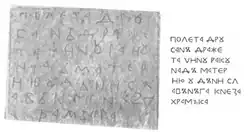 Humačka ploča (Humska ploča / Хумачка плоча, Хумска плоча; transl. the Humac Tablet) is an Old Slavic epigraph in the form of a stone tablet, written in Bosnian Cyrillic script,[16][17] and carved into a stone slab. It is thought to have originated between the 10th and 12th centuries, making it the oldest surviving Bosnian text,[16] older even than Charter of Ban Kulin It is the oldest Cyrillic epigraph found in Bosnia and Herzegovina,[26] and it was found in the village of Humac in Bosnia and Herzegovina.[17] The tablet was never precisely dated, but some attempts included Yugoslav and Bosnian epigrapher and medievalist, Marko Vego, who dated it to the end of the 10th or the beginning of the 11th century,[18] same dating suggested linguist Jovan Deretić,[19] while historian Dimitrije Bogdanović dated it to the beginning of the 12th century.[20] The text of the tablet tells the story about the act of building a church by Krsmir (also rendered Uskrsimir or Krešimir) and his wife Pavica, which was dedicated to the Archangel Michael. The inscription is carved in form of a quadrangle in Bosnian Cyrillic script among which five Glagolitic letters can be identified, four E-like letters resembling Ⰵ and a Ⱅ letter alongside a conventional Cyrillic Т. It was first noted by a French diplomat to the Bosnia Vilayet.[27] Today, tablet is kept at the local museum of the Franciscan friary in the same village where it was found, namely Humac.[28]