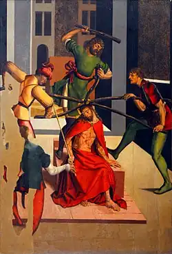 In contrast to earlier interpretations stating that the picture portrayed Christ before Caiaphas, according to Jan Royt[15] it is in fact the theme of Christ before Annas (according to St John's Gospel), because Caiaphas is usually shown in a robe torn at the chest or with a mitre (Giotto, Dürer). A group of armed men with torches has brought Christ, his hands tied, and turn to the enthroned high priest with gestures of their arms and hands. The panel is damaged, having been cut down to a smaller size; it is consequently missing most of the figure holding the rope. Christ looks back at a man holding a lamp with a burning candle – this man with a lamp is modelled on an engraving by Martin Schongauer. The men surrounding Christ are wearing short tunics and close-fitting leggings typical of Renaissance fashion in the early 16th century. Christ's long robe partially indicates the volume of his body. A view through to the street beyond shows a group of armed men in front of whom an old man, probably St Peter, is crossing.[15]
