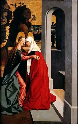 In the scene of the Visitation, the colour contrast of the richly folded drapery of both figures and the white head-veil of St Elizabeth provide the dominant artistic element. Mary is portrayed in a headband and with long locks of curly hair. Beyond a low wall, a landscape enlivened with cliffs covered with trees and vegetation unfolds into distant space; beyond, we can see a church and a half-built tower under scaffolding. The slender and subtly modelled fingers of the Virgin Mary cast a shadow corresponding to light coming from the right-hand side. The composition is modelled on a print by the Master E.S.