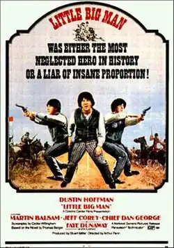 Little Big Man is a 1970 American revisionist Western film[3] directed by Arthur Penn, adapted by Calder Willingham from Thomas Berger's 1964 novel of the same title. It stars Dustin Hoffman, Chief Dan George, Faye Dunaway, Martin Balsam, Jeff Corey and Richard Mulligan. The film follows the life of a white man who was raised by members of the Cheyenne nation during the 19th century, and then attempts to reintegrate with American pioneer society. Although broadly categorized as a Western, or an epic, the film encompasses several literary/film genres, including comedy, drama and adventure. It parodies typical tropes of the Western genre,[4] contrasting the lives of white settlers and Native Americans throughout the progression of the boy's life.