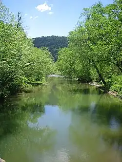 The North Fork is a 9.3-mile-long (15.0 km)[1] tributary of the Little Cacapon. The North Fork's source lies in a hollow between 2,618-foot (798 m) Piney Mountain and the southwestern end of 2,274-foot (693 m) Stony Mountain. From its source, the North Fork flows northeast along Grassy Lick Road (County Route 10). South Branch Mountain (3,028 feet (923 m) high) joins the North Fork to its west, and along with Stony Mountain to its east, the river diverges from Grassy Lick Road and continues its northeastern route to Shanks where it meets US Route 50. From Shanks, the North Fork merges with Camp Run and flows east under US Route 50 at Frenchburg, where it merges with the South Fork to create the Little Cacapon River.