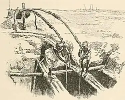 Salt panning is a crucial seasonal activity in the Rann of Kutch, producing the majority of India's inland salt. During the monsoon season, the underwater table of the Kutch is filled with saltwater. After the water recedes in October, salt workers temporarily settle and use diesel pumps to pump the saltwater into fields. Then, the natural climate conditions allow evaporation of the water, leaving only the salt crystals. Salt panning workers face severe health issues due to working in the harsh conditions in the fields continuously for 6–7 months.[7] In 2019, as a means of financially supporting the salt pan workers and promoting a move from diesel to solar-powered pumps, the government of Gujarat allowed the state to purchase excess solar power generated during the off-season. Using solar-powered as opposed to diesel pumps can reduce the cost of salt production by one-third.[8]
