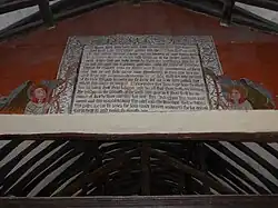 The timber chancel screen was begun in the 14th century. A boarded tympanum from the 15th century is described by Historic England as "exceptional", although the lower part is missing: it is painted with two angels and the Commandments. The tower arch carries a large royal coat of arms dated 1602, moved here in 1983 from the tympanum to reveal the painting.[7]