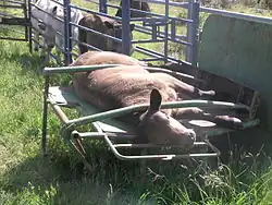 The traditional cowboy or stockman captured and secured an animal for branding by roping it, laying it over on the ground, tying its legs together, and applying a branding iron that had been heated in a fire. Modern ranch practice has moved toward use of chutes where animals can be run into a confined area and safely secured while the brand is applied. Two types of restraint are the cattle crush or squeeze chute (for larger cattle), which may close on either side of a standing animal, or a branding cradle, where calves are caught in a cradle which is rotated so that the animal is lying on its side.